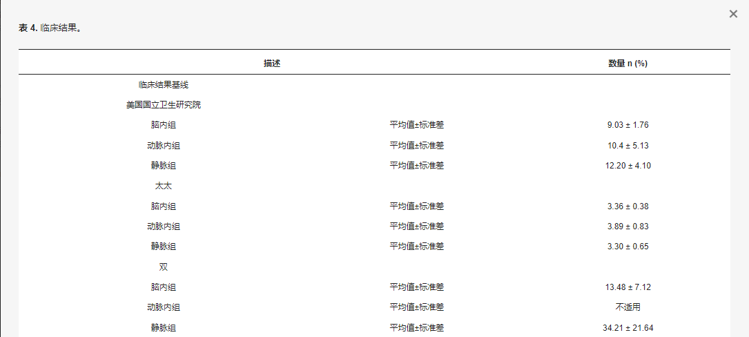 結果測量的類型:使用改良的Rankin量表 (mRS)、美國國立衛生研究院卒中量表 (NIHSS) 和Barthel 指數 (BI) 測量臨床結果。分析了干細胞給藥途徑的不良事件 (AE) 和嚴重不良事件 (SAE),以確定每種治療的安全性。