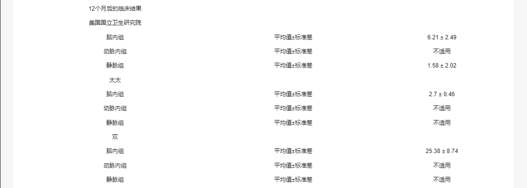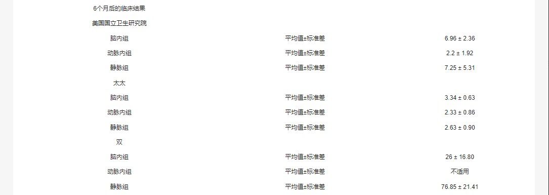 6個月后的NIHSS臨床結果顯示,腦內注射組下降了6.96±2.36,動脈內注射組下降了2.2±1.92,靜脈注射組下降了7.25±5.31。6個月后,腦內注射組的mRS評分也下降了3.34±0.63,動脈注射組下降了2.33 ±0.86,靜脈注射組下降了2.63±0.90。BI評分的改善以6個月后增加為標志,腦內組為26±16.80,靜脈內組為76.85±21.41,而動脈內組無可用數據。