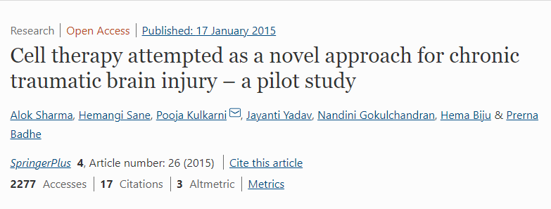 2015年,在一項小型的開放標簽、非隨機、非對照的試驗研究中,Sharma等人通過鞘內注射1×106個細胞/kg的自體BMMNCs治療14名慢性TBI的兒童和成人患者。在6個月時,3名患者的功能改善測量(FIM)有所改善,6名患者有所改善,7名患者的殘疾評分量表(DRS)沒有變化。此外,7名符合SF-8健康調查條件的患者在6個月時,身體部分的平均值和精神部分的平均值都有改善。