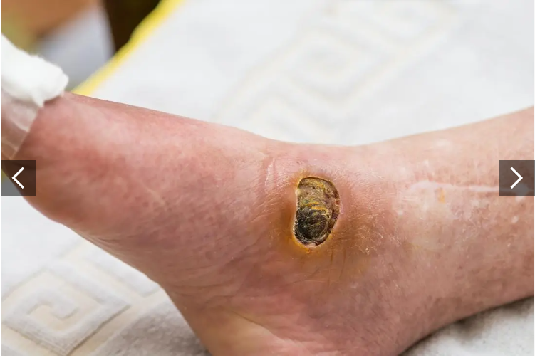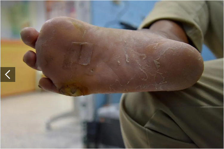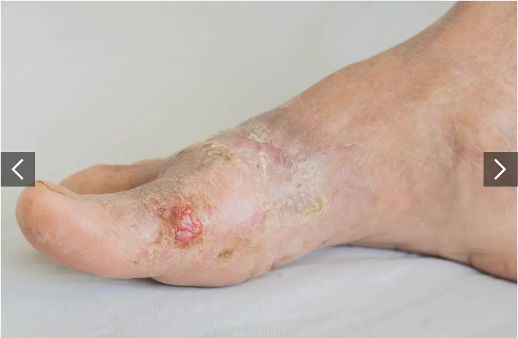 例如,腳上的水泡可能會潰爛,因為患者在早期感覺不到疼痛。隨著感染的發展,可能會形成壞疽。