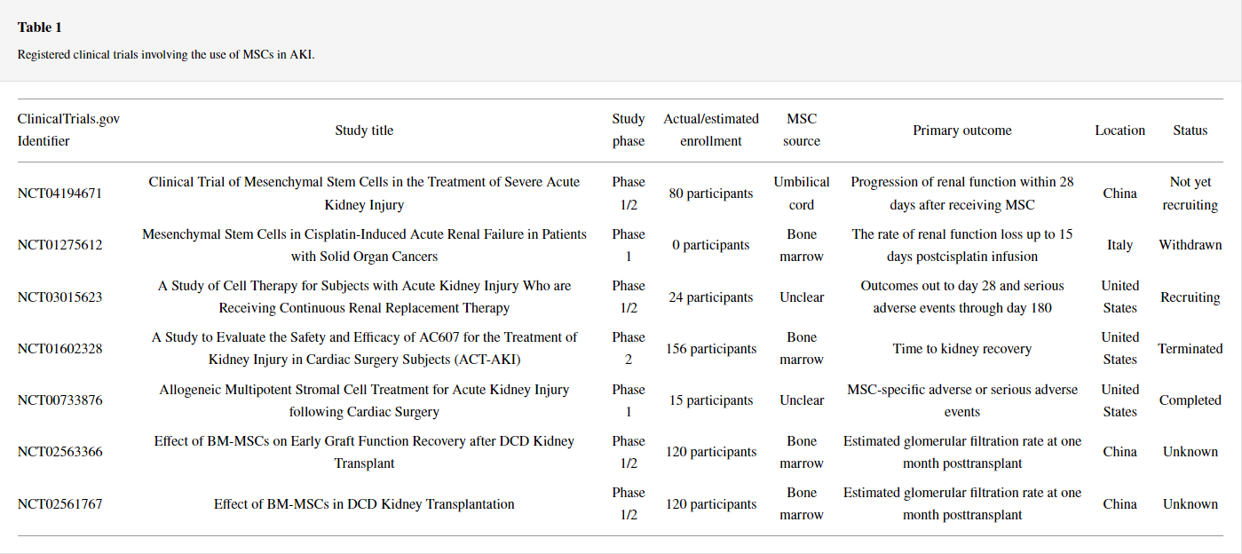 鑒于不同類型的臨床前AKI模型的有希望的結果,已經進行了幾項臨床試驗來評估基于MSC的干預措施對 AKI患者的安全性和有效性。
