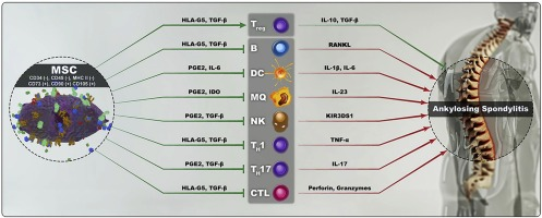 盡管使用NSAIDs、糖皮質(zhì)激素、DMARDs和生物藥物治療強(qiáng)直性脊柱炎取得了相當(dāng)大的成就,但尚未建立高效無副作用的治療方式。具有大量免疫調(diào)節(jié)和再生特性的間充質(zhì)干細(xì)胞是治療免疫介導(dǎo)疾病(如 AS)的有利治療選擇。間充質(zhì)干細(xì)胞可以調(diào)節(jié)與強(qiáng)直性脊柱炎發(fā)病機(jī)制相關(guān)的免疫細(xì)胞的激活,并可以促進(jìn)后續(xù)組織損傷的再生過程。
