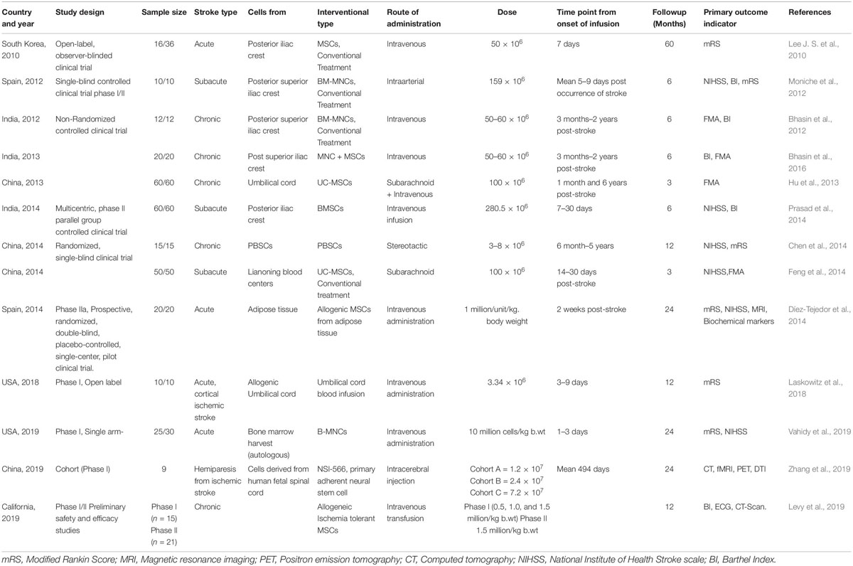 表格1介紹了一些涉及干細胞治療(自體和同種異體)的臨床試驗,給出了他們的研究設計、劑量、給藥途徑和結果。我們在中風再生醫學方面的經驗強調細胞的安全性和耐受性,但功效仍需解決。與僅接受物理治療的患者相比,接受自體骨髓來源細胞治療的患者的臨床和功能模式恢復得更好。我們主要針對間充質干細胞、脂肪組織干細胞和骨髓單核干細胞等不同干細胞進行了各種臨床試驗。正在進行中(表1)調查了潛在的功效和安全性,沒有發生任何不良或嚴重不良事件。