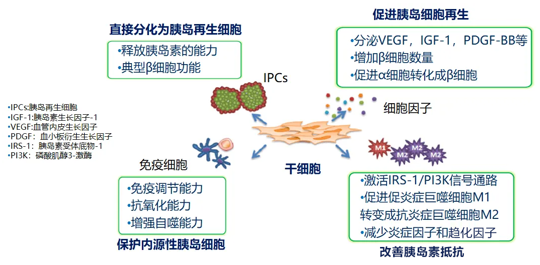 2. 細胞因子治療:干細胞可以分泌多種細胞因子,這些細胞因子對胰島細胞的功能和增殖具有促進作用。通過注射干細胞或使用干細胞培養上清液中的細胞因子,可以增強胰島細胞的功能,提高胰島素的分泌能力,并改善胰島細胞的耐受性。
