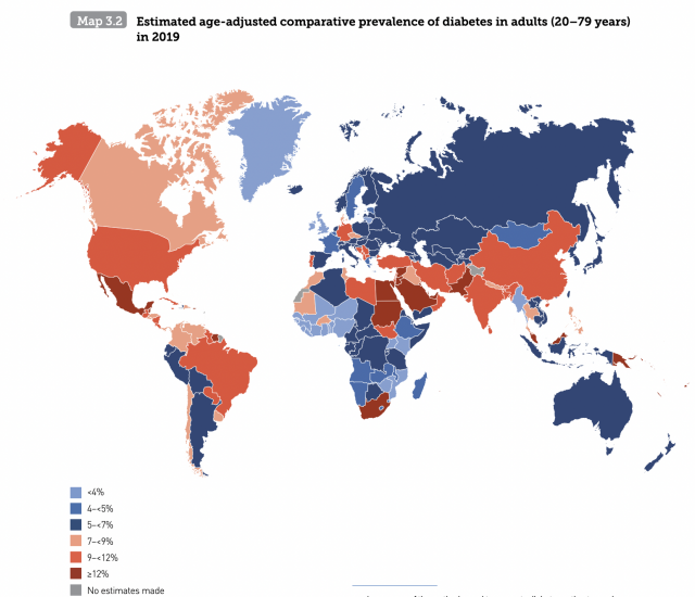 一個國家和另一個國家的糖尿病患病率差異很大。以下是按國家劃分的年齡調(diào)整后糖尿病患病率地圖: