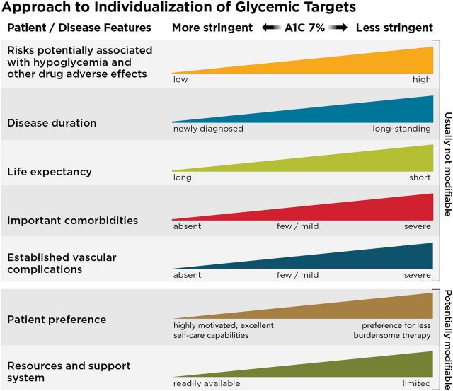 官方建議確實有一些回旋余地。美國糖尿病協會的這張圖表列出了一些其他因素,這些因素可能表明患者何時應該以較低(或較高)的血糖水平為目標: