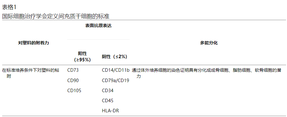 間充質(zhì)干細(xì)胞可以分化為中胚層或外胚層細(xì)胞,從而產(chǎn)生貼壁的多能成纖維細(xì)胞型干細(xì)胞。不同的研究人員以不同的方式定義MSC特征。為了解決這個問題,國際細(xì)胞治療學(xué)會推薦了一組三個標(biāo)準(zhǔn)來定義人類間充質(zhì)干細(xì)胞:粘附性、特異性表面抗原表達(dá)和多能分化潛能(表1)。