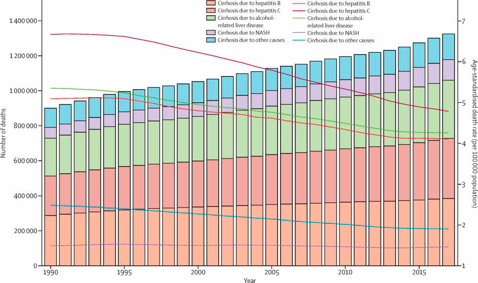 條形表示每年的死亡人數。線條指的是每年的年齡標準化死亡率。NASH = 非酒精性脂肪性肝炎。