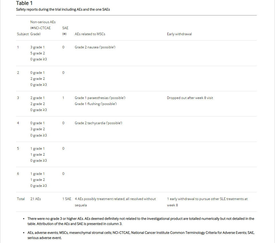 如表1所示,在52周的試驗中總共出現(xiàn)了21個AE。沒有一個是3級或更高級別,只有4個感覺可能與MSC輸注有關(guān),并且都很快得到解決。這些癥狀包括輕度惡心、感覺異常和潮紅。六名參與者沒有出現(xiàn)與實驗室相關(guān)的AE。
