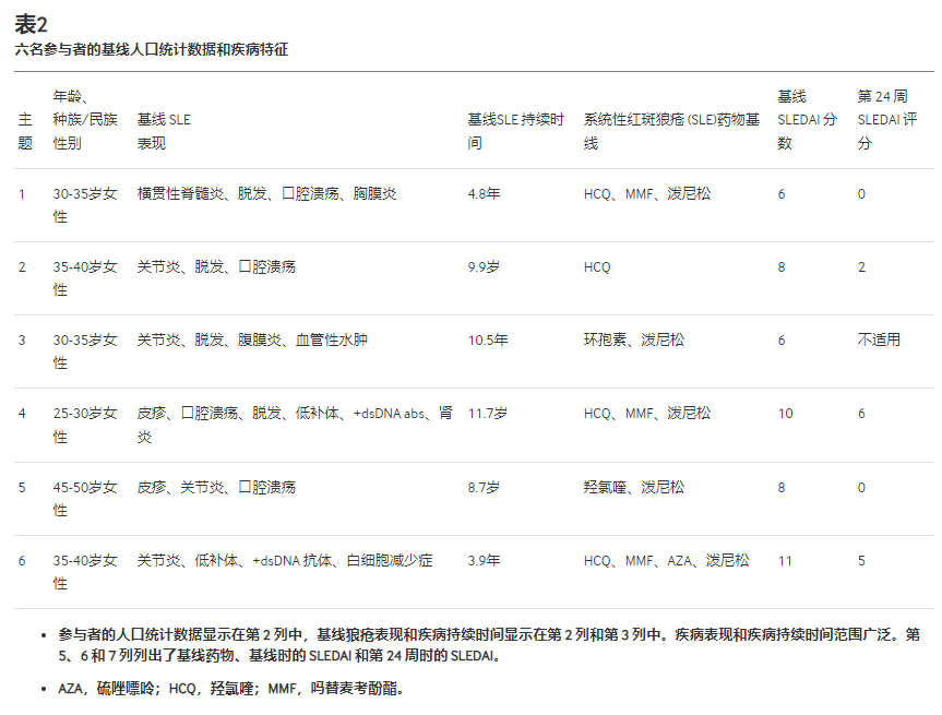 入組的6名患者均為女性,平均年齡38歲(范圍26-48歲)。兩名參與者是非裔美國人,一名是西班牙裔,三名是白人。平均病程為8.2年(范圍為3.9-11.7年)。一名患者在兒童時期發(fā)病。基線疾病特征見表2。盡管進行了免疫抑制和生物治療,一名患者仍出現(xiàn)難治性橫貫性脊髓炎發(fā)作。一名患有腎臟疾病的患者在接受霉苯酯 (MMF) 治療后持續(xù)出現(xiàn)蛋白尿。除一名患者外,所有患者均服用羥氯喹和潑尼松。兩名患者使用MMF,一名患者使用硫唑嘌呤和MMF,一名患者使用環(huán)孢菌素。其中兩人因多次免疫抑制治療方案失敗而未服用免疫抑制劑。在整個試驗過程中,所有患者均繼續(xù)接受基線藥物治療。