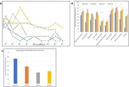 (B) 狼瘡影響追蹤器 (LIT) 是指研究期間的影響。從第12周開始,LIT顯著下降,并持續(xù)到第52周 (p=0.007)。誤差線表示SD。代表完成試驗至52周的5名患者的分數(shù)。