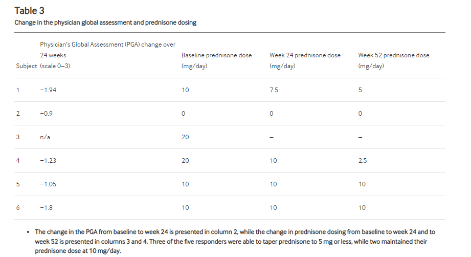從24周到52周,5名應(yīng)答者的臨床應(yīng)答穩(wěn)定或進一步改善(圖1A和在線補充表1)。5/6名應(yīng)答者的醫(yī)生和患者總體評價均有明顯改善(表3和數(shù)據(jù)未顯示)。潑尼松可逐漸減少或維持在每天10毫克或更少(表 3)。LIT有持續(xù)的反應(yīng)(圖1C)。隨后,在研究結(jié)束后的18到48個月期間,有四名患者的病情復(fù)發(fā)?;颊?1在輸液后20個月時胸脊髓橫貫性脊髓炎復(fù)發(fā)。她接受了賽妥生(Cytoxan)和清除術(shù)治療,并用間充質(zhì)干細胞進行了再治療。34個月后,她的病情沒有復(fù)發(fā)。其他三位參與者的關(guān)節(jié)炎和皮膚病復(fù)發(fā)程度較輕,但沒有接受間充質(zhì)干細胞治療。