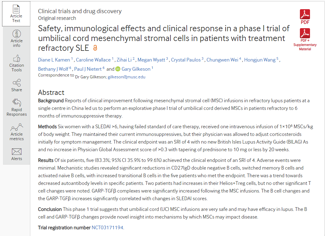 背景:我國南京鼓樓醫(yī)院通過干細胞治療難治性狼瘡患者后臨床改善的報告促使我們對經(jīng)6個月的免疫抑制治療難治的患者進行臍帶來源的MSC的探索性I期試驗。