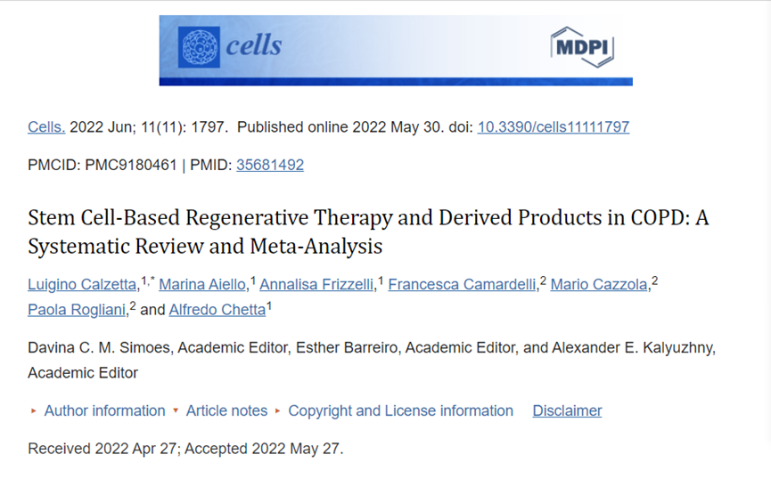4、2022年,意大利帕爾馬大學的研究團隊在cells雜志上發表了基于干細胞的再生療法以及衍生產品對慢性阻塞性肺病(COPD)患者的治療效果,本研究對11項臨床研究進行分析,共抽取371名例COPD患者資料。