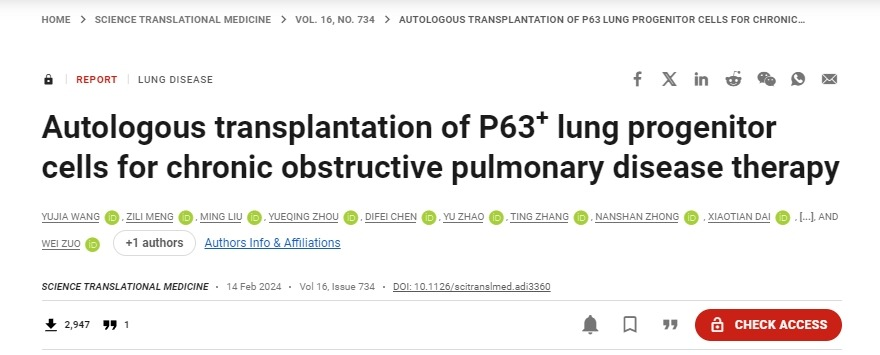 2024年2月14日,同濟大學醫學院附屬東方醫院左為教授團隊,與廣州醫科大學附屬第一醫院鐘南山院士、李時悅教授團隊,以及陸軍軍醫大學附屬西南醫院戴曉天教授合作,在全球頂級轉化醫學刊物《科學-轉化醫學》雜志發表了題為“移植自體P63陽性肺前體細胞用于慢性阻塞性肺病的治療”的研究論文。[9]