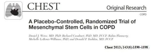 2013年,《Chest》雜志上發(fā)表了間充質(zhì)干細(xì)胞治療中、重度慢阻肺的安全性和有效性的臨床研究報告。在此項研究中共收治了62名慢阻肺患者,并隨機(jī)分為試驗組和對照組,試驗組患者通過靜脈輸注的方式進(jìn)行間充質(zhì)干細(xì)胞治療,每月1次,共4次。