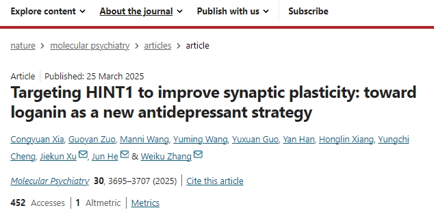 2025年3月25日,北京中醫(yī)藥大學(xué)續(xù)潔琨教授團(tuán)隊(duì)牽頭在IF=9.6期刊《Mol Psychiatry》發(fā)表標(biāo)題為《靶向HINT1改善突觸可塑性:邁向馬錢苷作為一種新的抗抑郁策略》的研究成果。[3]