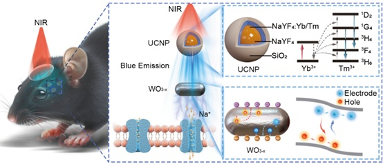 通過(guò)“近紅外光穿透+光電轉(zhuǎn)換”機(jī)制實(shí)現(xiàn)深部腦區(qū)調(diào)控:納米顆粒將近紅外光轉(zhuǎn)化為藍(lán)光,光伏材料進(jìn)一步將藍(lán)光轉(zhuǎn)化為局部電刺激,無(wú)需基因修飾即可精準(zhǔn)干預(yù)神經(jīng)活動(dòng)。