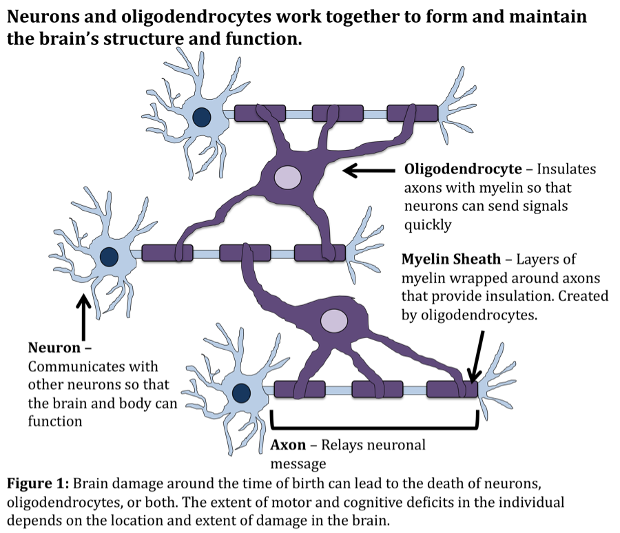 當大腦在敏感的圍產期發生損傷時,常駐的腦細胞就無法促進大腦的正常生長和發育。神經元和少突膠質細胞死亡和/或無法成熟,連接各個大腦區域的白質束受損。重要的是,連接大腦運動區和脊髓并幫助控制運動的皮質脊髓束(CST)經常受到損傷。如果沒有功能性CST連接,就會出現運動缺陷。
