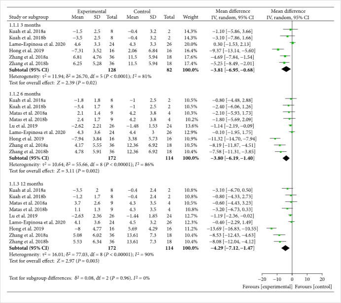 主要結果表明,MSCs可以在第3個月的隨訪中減少WOMAC疼痛和VAS[WOMAC 疼痛:-3.81(-6.95,-0.68),. VAS:-1.11(-1.53??,-0.68),效果至少持續12個月【WOMAC痛:-4.29(-7.12,-1.47),. VAS:-1.77(-2.43,-1.12)。MSC還可以在第6個月的隨訪中降低WOMAC硬度和身體功能 [WOMAC 硬度:-1.12(-2.09,-0.14)。WOMAC物理機能:-4.40(-6.84,-1.96),】,效果至少持續12個月【WOMAC剛度:-0.99(-1.95,-0.03)。WOMAC物理機能:-3.26(-5.91,-0.61)。WOMAC疼痛、VAS、WOMAC僵硬和WOMAC身體功能的改善可能具有臨床意義。