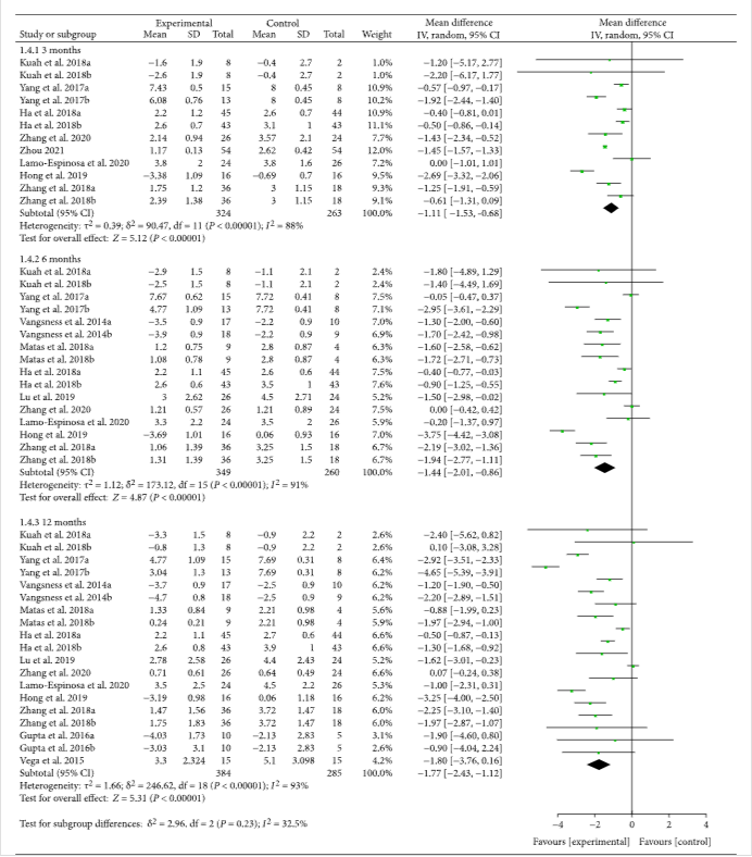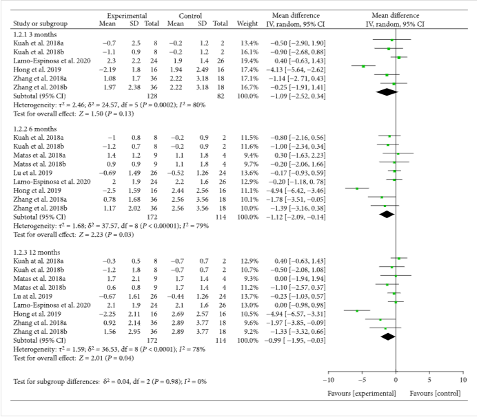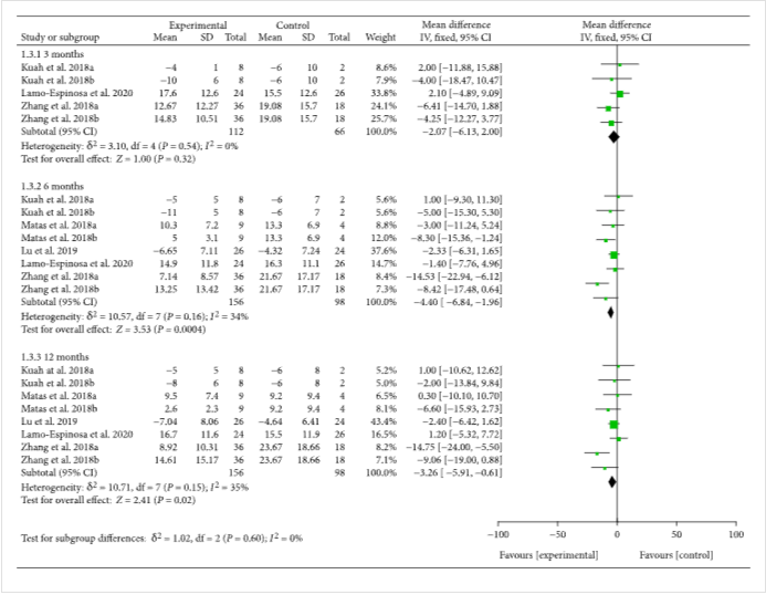十三項臨床試驗報告了具有精確值的VAS。結果還顯示,MSC注射后第3個月隨訪VAS較對照組有所降低[-1.11(-1.53??,-0.68),],且效果至少持續12個月[-1.77(-2.43,-1.12),](圖2)。VAS的改善可能具有臨床意義。