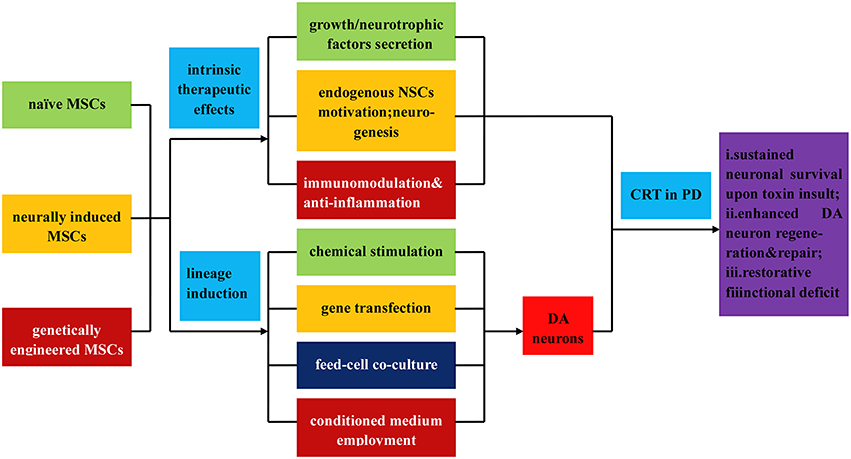 其中,干細胞衍生的神經干細胞可以通過以下兩種方案進一步誘導分化為多巴胺神經元:(i)添加生長因子、神經營養因子、細胞因子等。培養基誘導神經球形成;(ii) 與永生化 NSC 系共培養以引入基因修飾因子。當將上述可行的NSCs和感受態DA神經元應用于PD的CRT治療時,可以觀察到改善的神經元存活狀態和恢復性功能缺陷。