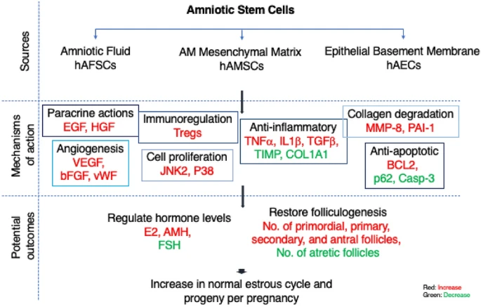 在這些研究中,hAMSCs展示了它們通過改善卵巢局部微環境、通過旁分泌作用維持子宮內膜再生/或調節細胞因子。在hAMSCs移植后,在生理和分子水平上觀察到卵巢功能的顯著改善。卵巢功能和生育能力的提高歸因于卵巢形態的改善、卵泡數量的增加、動情周期的恢復以及激素水平的提高(例如,AMH)。由hAMSCs分泌的旁分泌因子,如EGF(表皮生長因子)和HGF(肝細胞生長因子)被證明可以恢復激素水平和卵泡數量,但是,作者沒有報告隨后的生育率、后代增加或改善在發情周期規律性。由于抑制細胞凋亡和誘導細胞增殖等分子事件的發生,觀察到總卵泡計數和激素水平的顯著改善。
