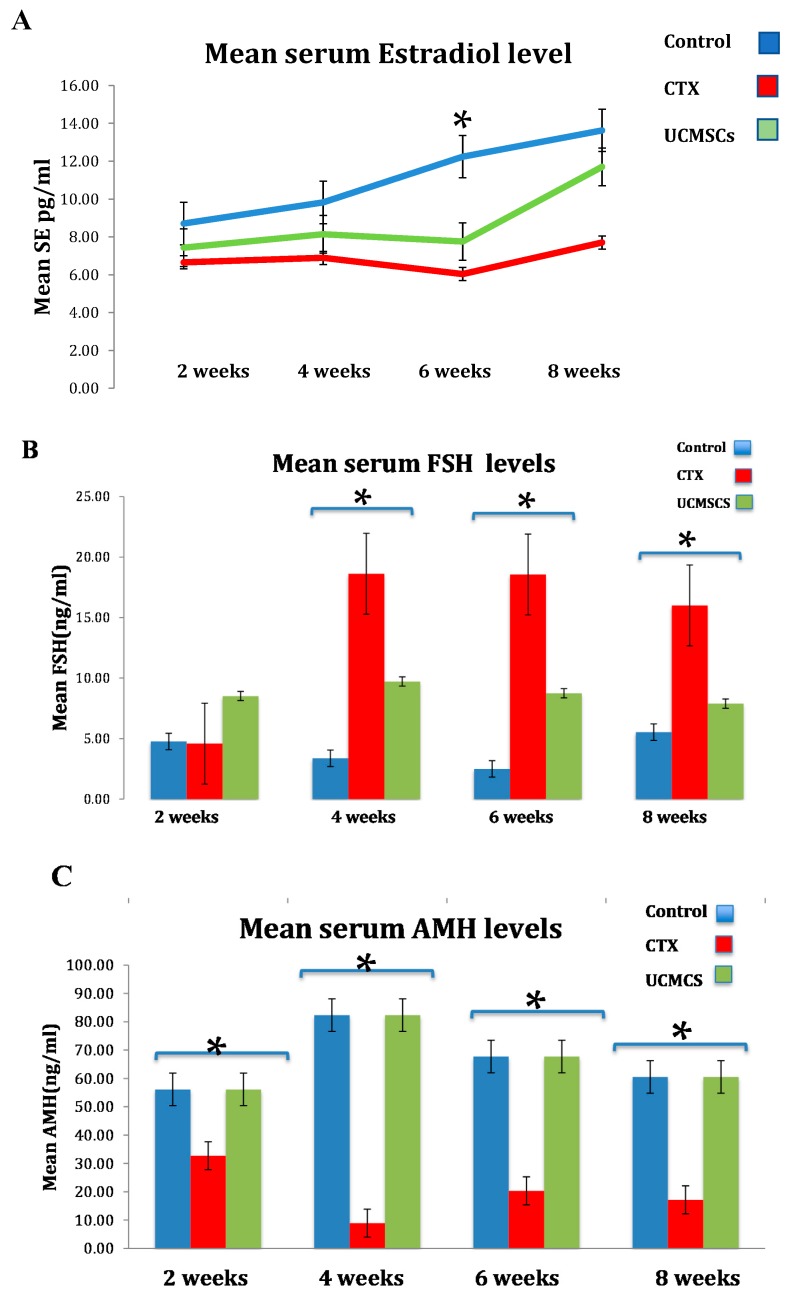 與第2組相比,第3組的激素特征顯示為血清FSH水平顯著降低40%±5 ( p<0.05),血清AMH水平顯著升高50%±2 ( p<0.05)。此外,與對照組相比,CTX 組的雌二醇顯著下降,然而,UCMSCs組對對照組的正常水平表現(xiàn)出不斷升級的態(tài)度(圖3)。