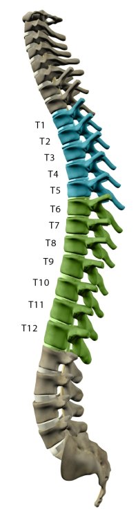 胸椎位于背部的上部和中部。胸椎有12塊椎骨,編號為T-1至T-12。每個數字對應于脊髓該部分的神經: