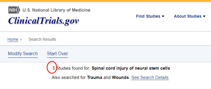 當前,隨著干細胞研究的不斷深入,越來越多的學者致力于將間充質干細胞等不同類型干細胞應用到脊髓損傷治療相關的研究中。截止至目前,已有5項注冊的神經干細胞治療脊髓損傷相關臨床試驗登記注冊在clinicaltrials.gov。
