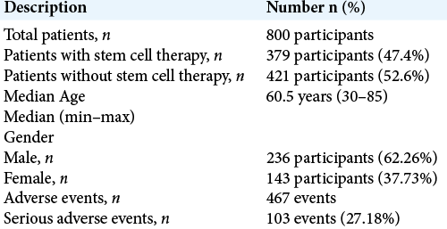 然后將患者分為兩組:實驗/治療組(379名患者)和未接受干細胞治療的對照組(421名患者)。19項不同的研究報告了467次不良事件。在這467起記錄的不良事件中,有103起 (27.18%) 是嚴重的。結果摘要顯示在表2。