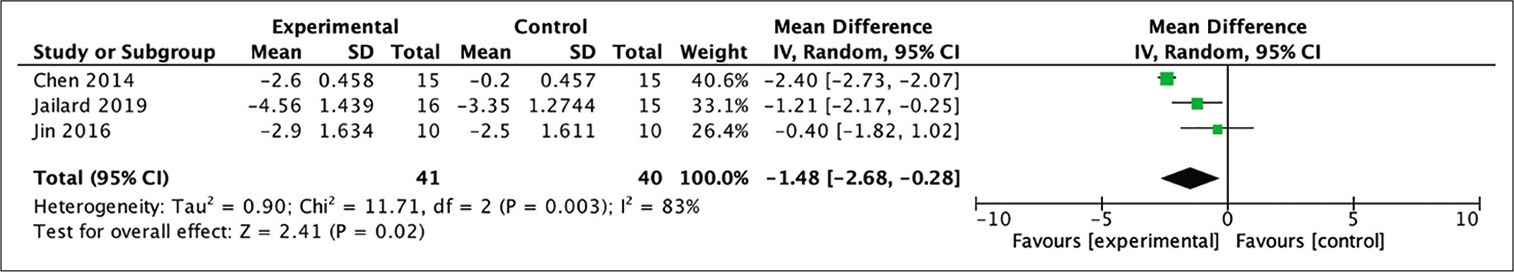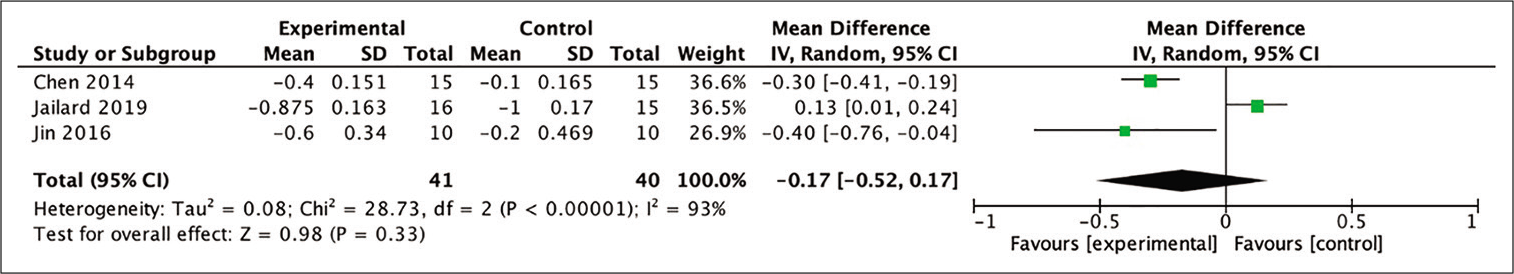干細胞治療組的平均差異在統計學上更大,盡管這一結果沒有統計學意義(MD = -0.27;95% CI -0.52–0.17;P = 0.33;I 2 = 93%)。