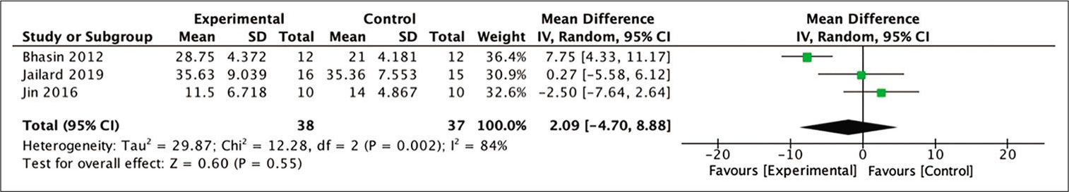 薈萃分析中包含的四項研究中有兩項能夠通過計算基線和治療后12個月mRS評分之間的平均差來分析以確定mRS評分的改善情況。從這兩項研究中,對干細胞治療組和對照組之間第12個月mRS評分平均差異的薈萃分析表明,接受干細胞治療的組在統計學上有更有利的趨勢。該結果顯示在[圖8]。