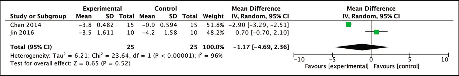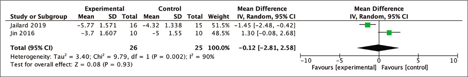 薈萃分析中四項研究中的兩項能夠分析基線和24個月治療后mRS評分之間的平均差異。獲得的分析結果表明,與未接受干細胞治療的患者相比,接受干細胞治療的患者具有更有利的結果。但統計分析證明,這一結果沒有統計學意義。分析圖如圖[圖10]。
