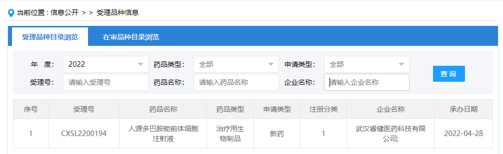 2022年4月28日,據(jù)國(guó)家藥監(jiān)局藥品審查中心(CDE)官網(wǎng)-受理品種信息公示,武漢睿健醫(yī)藥科技有限公司(簡(jiǎn)稱(chēng)“睿健醫(yī)藥”)“人源多巴胺能前體細(xì)胞注射液”(代號(hào):NouvNeu001)臨床試驗(yàn)申請(qǐng)(IND)已獲受理(受理號(hào):CXSL2200194)。