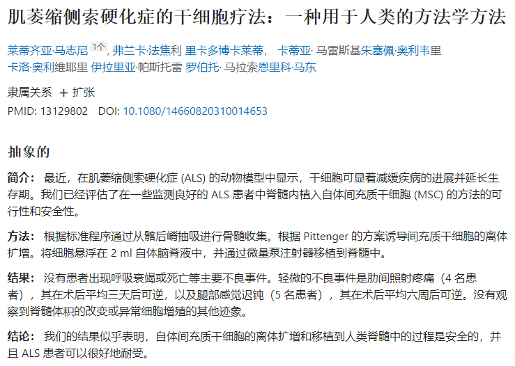 - Aljabri Ammar, Halawani Alhussain, Bin Lajdam Ghassan, Labban Suhail, Alshehri Samah, Felemban Razaz. The Safety and Efficacy of Stem Cell Therapy as an Emerging Therapy for ALS: A Systematic Review of Controlled Clinical Trials.?Frontiers in Neurology, 12, 2021.?DOI=10.3389/fneur.2021.783122