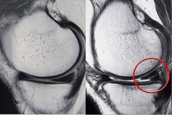 MRI 掃描顯示(左)正常的半月板和(右)撕裂的半月板。撕裂可以看作是穿過半月板黑色主體的白線
