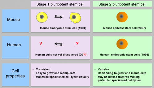 小鼠和人類(lèi)ES細(xì)胞并不等同;人類(lèi)ES細(xì)胞似乎代表處于胚胎發(fā)育更高級(jí)階段的細(xì)胞,此時(shí)它們已經(jīng)開(kāi)始專(zhuān)門(mén)化。科學(xué)家們認(rèn)為,有可能分離出一種與小鼠胚胎干細(xì)胞相當(dāng)?shù)男滦腿祟?lèi)多能干細(xì)胞。這些新細(xì)胞——如上圖所示為“1 期多能干細(xì)胞”,通常被稱(chēng)為“基態(tài)干細(xì)胞”——預(yù)計(jì)具有非常一致的特性,可以可靠地分化成所有類(lèi)型的特化成體細(xì)胞。世界各地的研究人員目前正在研究如何分離和培養(yǎng)這些人類(lèi)基態(tài)細(xì)胞。
