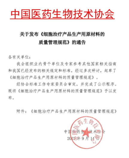 吉林中科生物工程股份有限公司參與制定:《細胞治療產品生產用原材料的質量管理規范》
