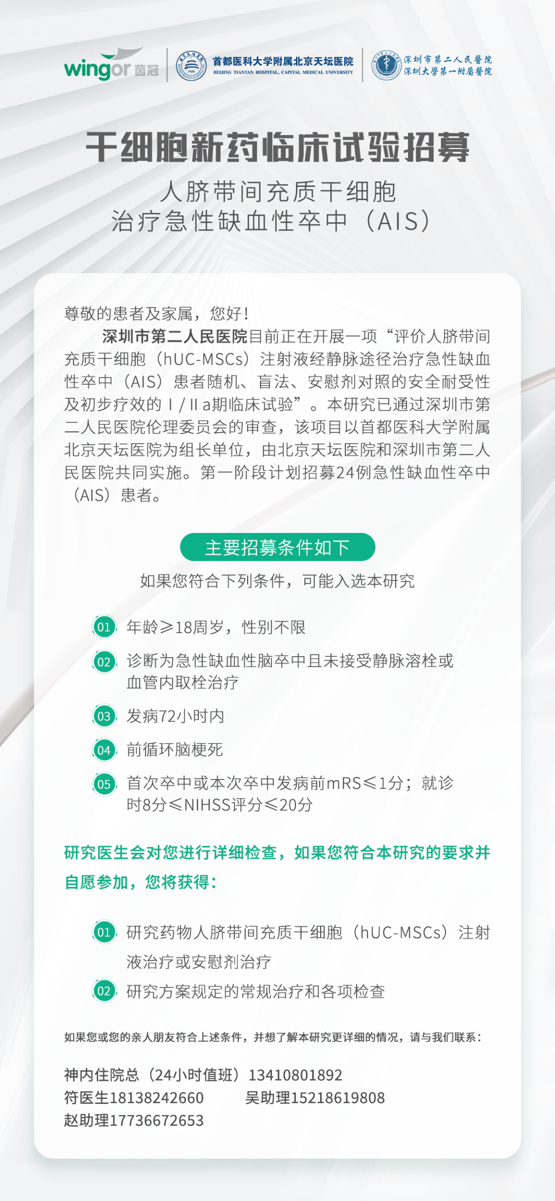 現階段,該公司正與首都醫科大學附屬北京天壇醫院和深圳市第二人民醫院合作,共同實施名為“評價人臍帶間充質干細胞治療急性缺血性卒中患者的Ⅰ/Ⅱa期臨床試驗”。該研究已獲深圳市第二人民醫院倫理委員會批準。