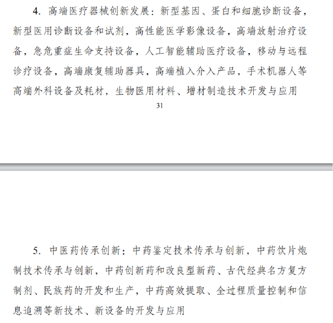 4.高端醫療器械創新發展:新型基因、蛋白和細胞診斷設備,新型醫用診斷設備和試劑,高性能醫學影像設備,高端放射治療設備,急危重癥生命支持設備,人工智能輔助醫療設備,移動與遠程診療設備,高端康復輔助器具,高端植入介入產品,手術機器人等高端外科設備及耗材,生物醫用材料、增材制造技術開發與應用