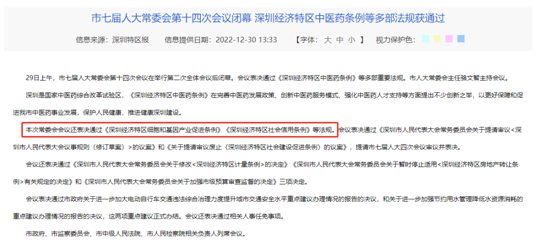 2022年12月29日上午,深圳市第七屆人大常委會第十四次會議在舉行第二次全體會議后閉幕。會議表決通過多部重要法規,其中,《深圳經濟特區細胞和基因產業促進條例》正式通過表決。