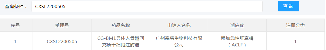 廣州賽雋生物科技有限公司的“CG-BM1異體人骨髓間充質干細胞注射液”(受理號:CXSL2200505)獲得新藥臨床試驗默示許可,適應證為:慢加急性肝衰竭(ACLF)。這是該干細胞注射液的第二種適應證,此前已獲得默示許可用于注射給藥用于感染引起的中重度成人急性呼吸窘迫綜合征(ARDS)(受理號:CXSL2101334)的臨床試驗。