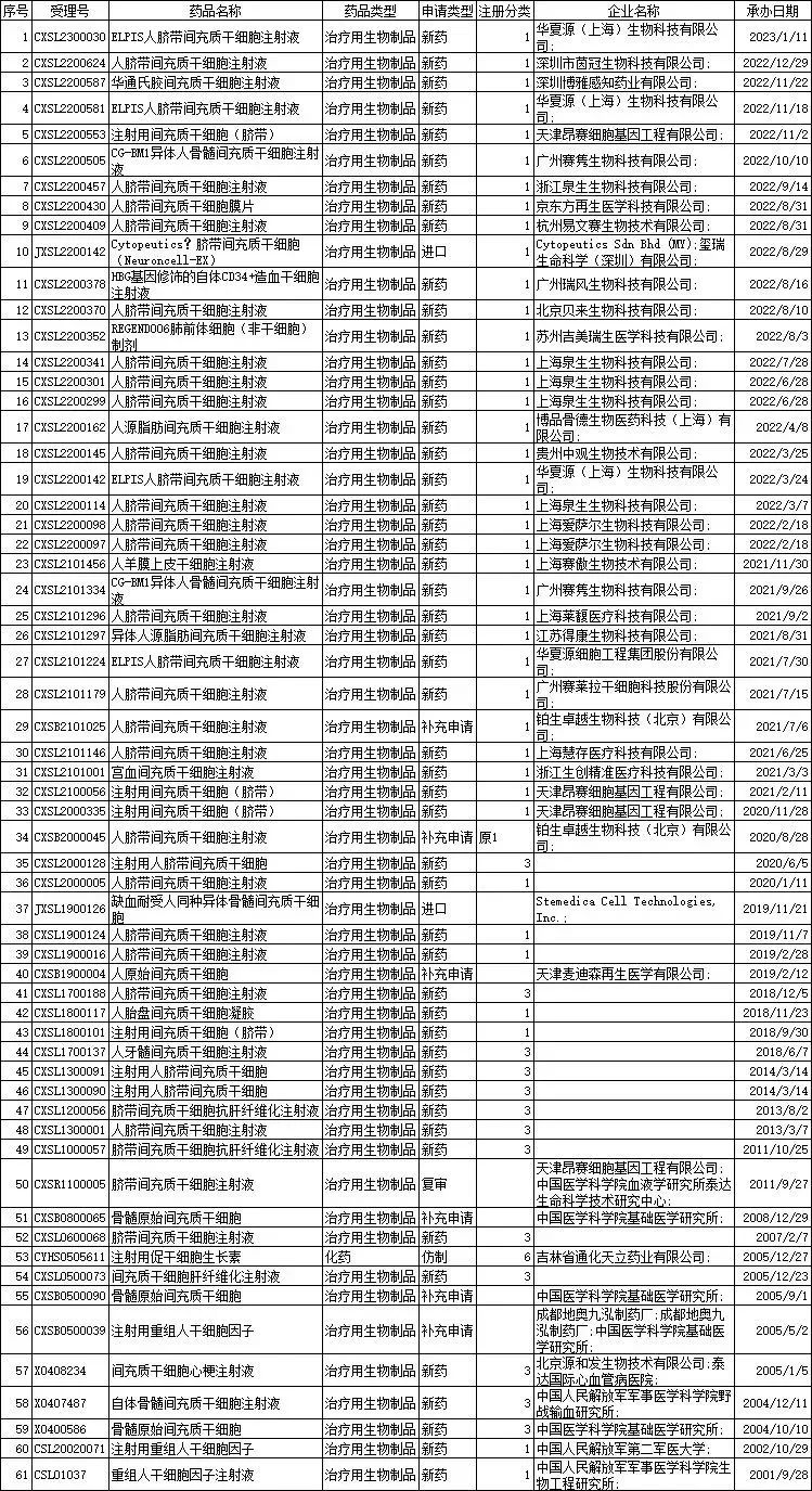 獲得國家藥品監督管理局藥物臨床試驗批準的干細胞項目61項(結止2023年1月)